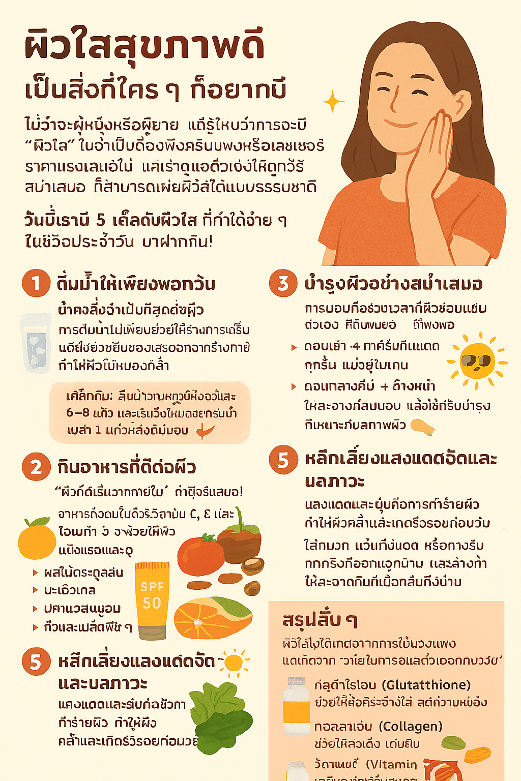 ผิวใสสุขภาพดี เป็นสิ่งที่ใคร ๆ ก็อยากมี ไม่ว่าจะผู้หญิงหรือผู้ชาย แต่รู้ไหมว่าการจะมี “ผิวใส” ไม่จำเป็นต้องพึ่งครีมแพงหรือเลเซอร์ราคาแรงเสมอไป แค่เราดูแลตัวเองให้ถูกวิธี สม่ำเสมอ ก็สามารถเผยผิวใสได้แบ... อ่านต่อ »
