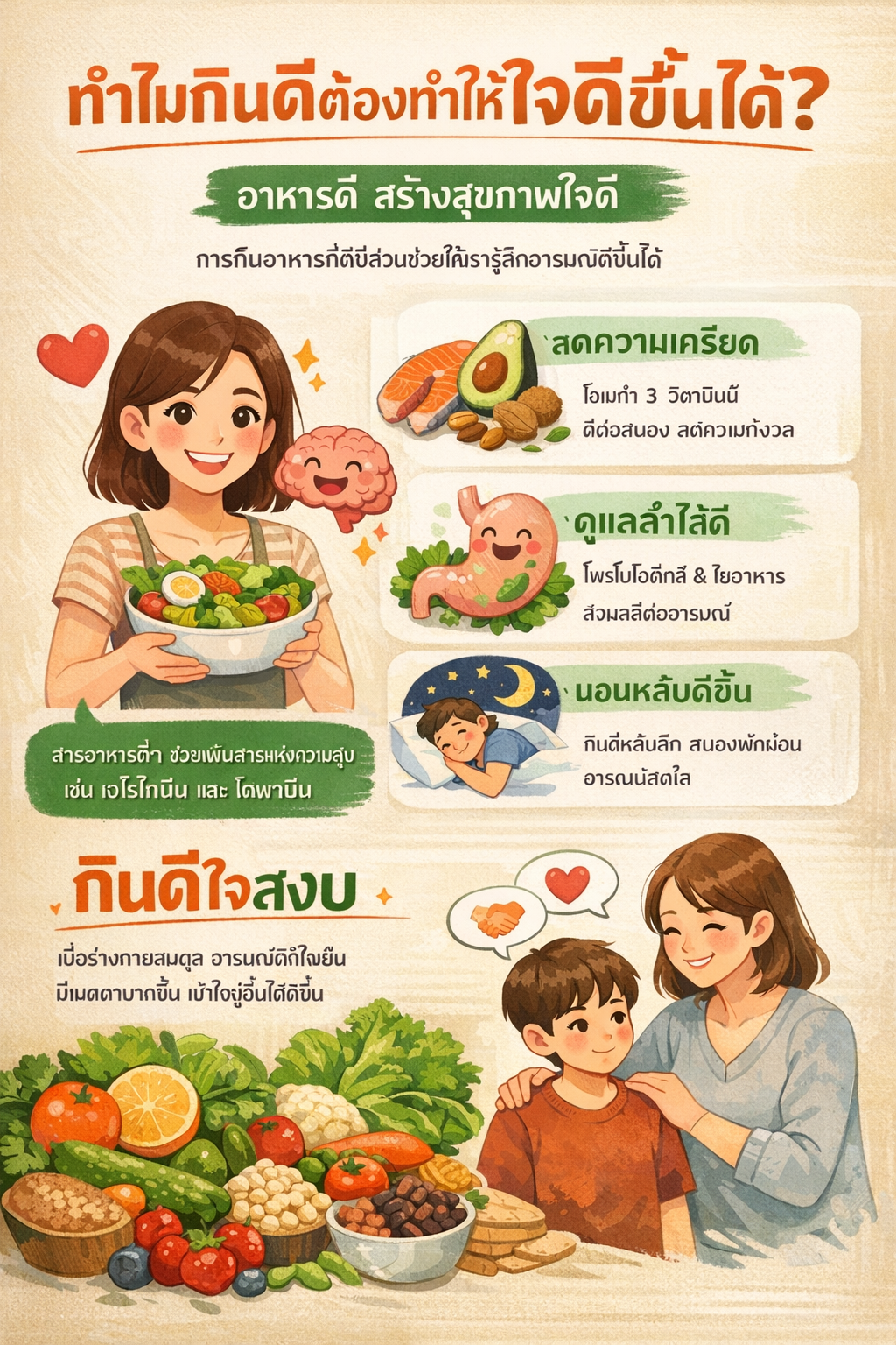 การกินอาหารที่ดี ไม่ได้ช่วยแค่สุขภาพกาย แต่ยังส่งผลโดยตรงต่อสุขภาพใจและอารมณ์ เพราะสารอาหารบางชนิดสามารถกระตุ้นสารสื่อประสาทแห่งความสุข เช่น เซโรโทนินและโดพามีน รวมถึงการดูแลลำไส้ที่มีผลต่อสมองโดยตรง ... อ่านต่อ »