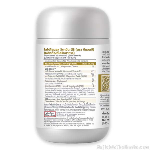 คำเตือน : เด็กและสตรีมีครรภ์ไม่ควรรับประทาน, ไม่มีผลป้องกันหรือรักษาโรค, มีส่วนประกอบของถั่วเหลือง