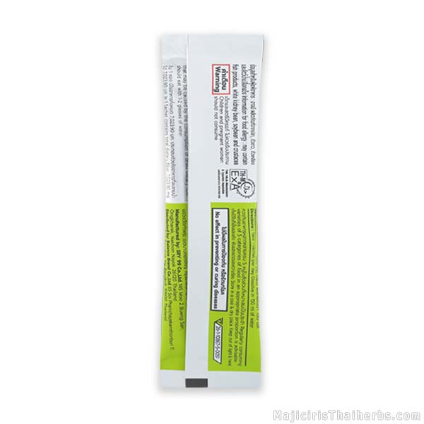 วิธีรับประทาน : ชง 1 ซอง ในน้ำ 200 ml ดื่มทันทีหลังชง และดื่มน้ำเปล่าตาม 1–2 แก้ว